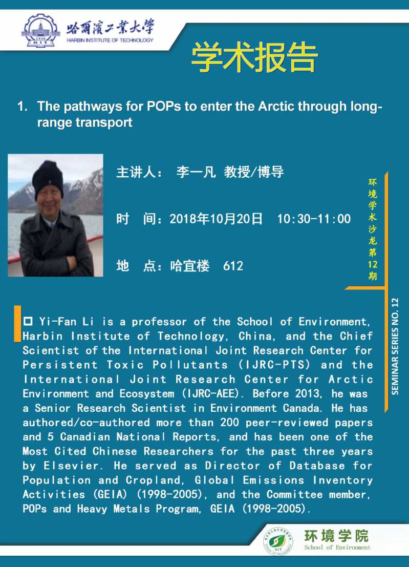 讲座题目: The pathways for POPs to enter the Arctic through long-range transport