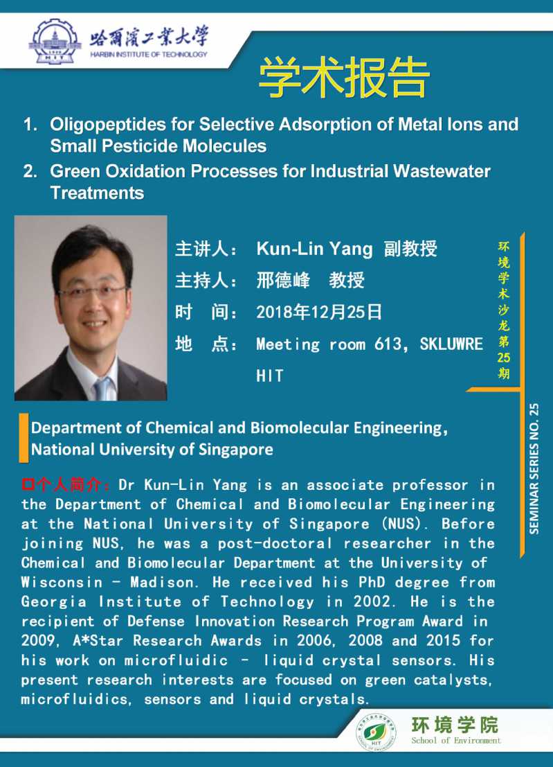 新加坡国立大学 Kun-Lin Yang教授将于2018年12月25日访问彩客网-彩客网比分 并进行学术交流,欢迎全校感兴趣的师生参加。学术讲座信息如下:
