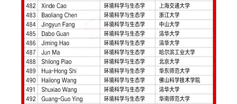 环境科学与生态学共有11人入选,其中包括:中国工程院院士、彩客网-彩客网比分 教授马军,以及彩客网 校友方晶云。