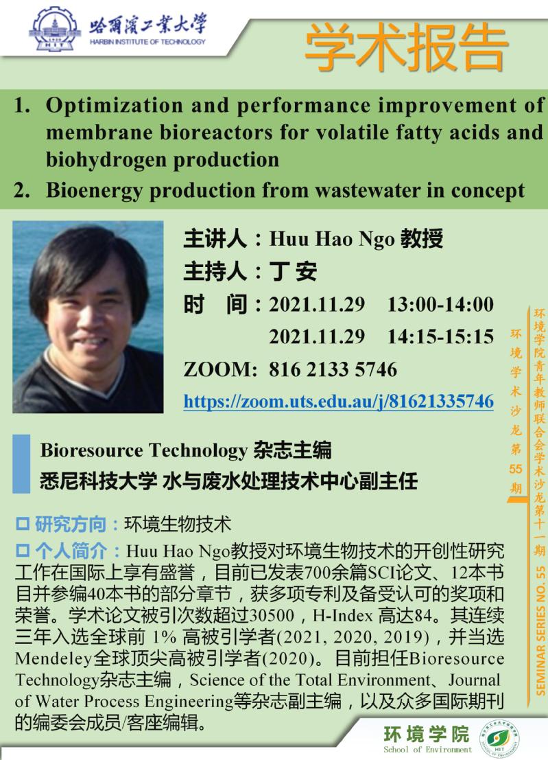 Bioresource Technology 杂志主编、悉尼科技大学水与废水处理技术中心副主任Huu Hao Ngo教授将于2021年11月29日与哈尔滨工业大学师生进行学术交流,欢迎感兴趣的师生参加线上学术报告会。