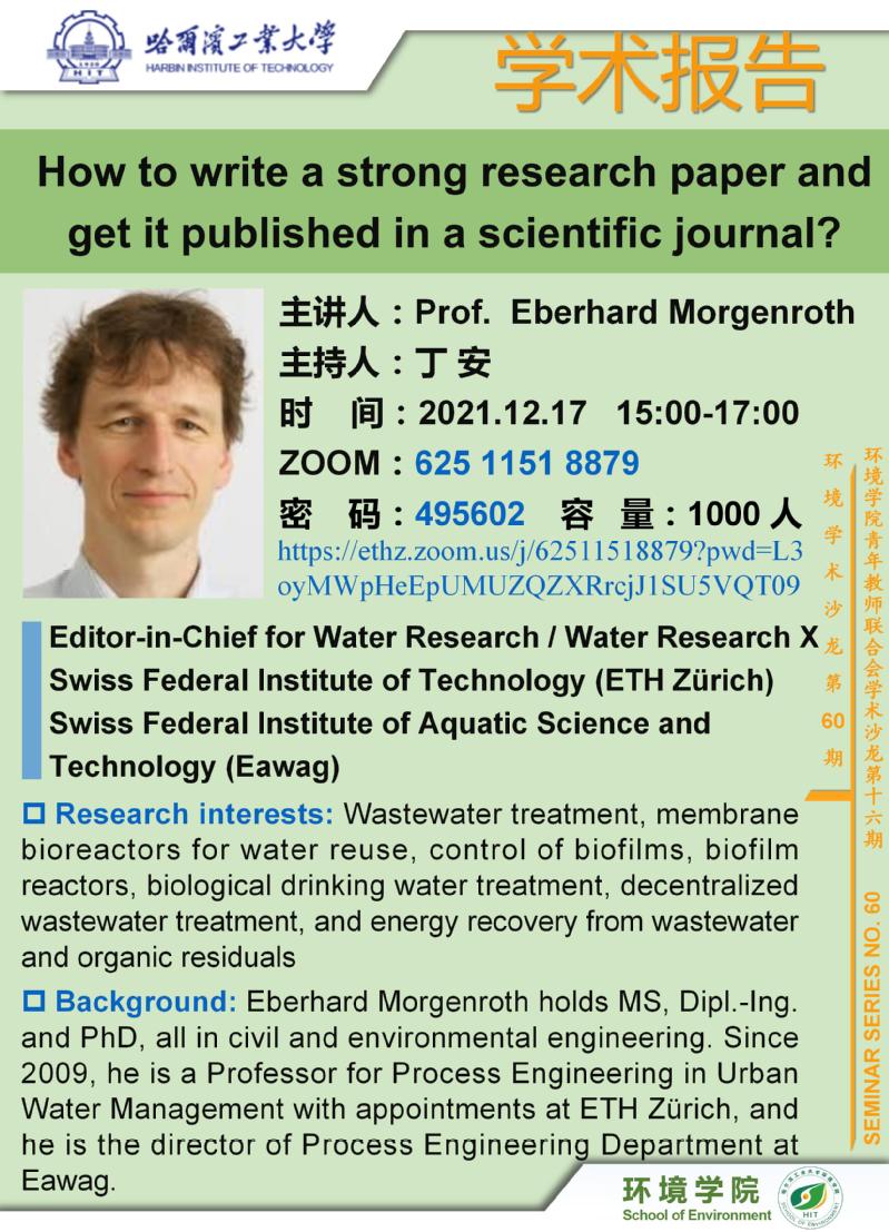 《Water Research》主编Eberhard Morgenroth教授将于2021年12月17日哈尔滨工业大学师生进行学术交流,欢迎感兴趣的师生参加线上学术报告会。