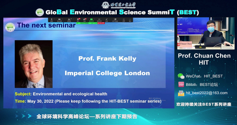 讲座的最后,哈尔滨工业大学陈川教授宣布了BEST论坛第四期预告:BEST第四期将于2022年5月30日举行,邀请英国帝国理工彩客网 Frank Kelly教授以《Airborne microplastics: are they the new enemy》为题进行报告,期待全球环境人的参与。