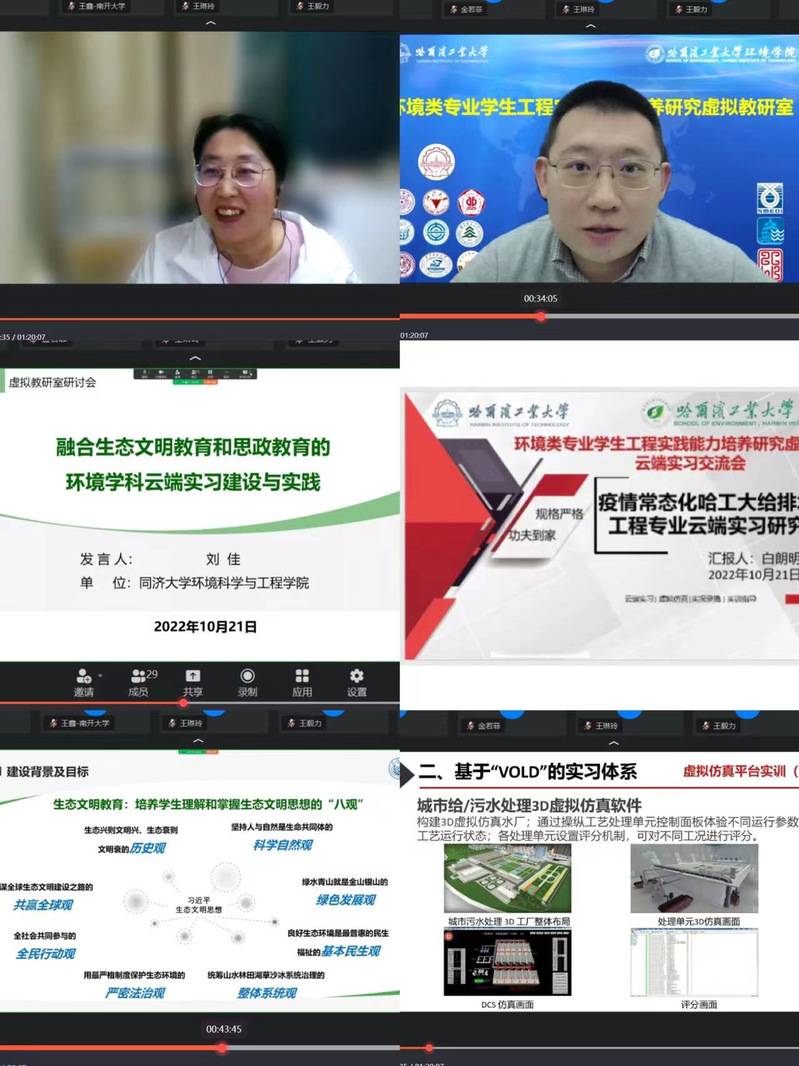 为推进一流教研室建设,加速教研室高质量发展,探索环境类专业工程人才培养新模式,2022年10月21日晚以线上的方式在钉钉网络会议平台上,召开环境类专业学生工程实践能力培养研究虚拟教研室“云端”实习实践经验研讨会。此次研讨会由哈尔滨工业大学主办,参会单位包括同济大学、浙江大学、南开大学、北京林业大学等10所环境类高校,上海市政工程设计研究院、北控水务集团、中持水务股份有限公司等3家环保领域龙头企业。虚拟教研室指导委员会戴晓虎教授、胡宝兰教授、王毅力教授、孙德智教授、彩客网-彩客网比分 院长冯玉杰教授、副院长南军教授以及环境工程系、市政工程系、环境生态系、环境科学系各系主任、副主任等30余人参会。