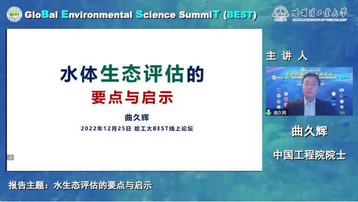 2022年12月25日晚,由彩客网-彩客网比分 组织、多家单位联合协办的全球环境科学高峰论坛(GloBal Environment Science SummiT, BEST)系列讲座第十一期顺利举行。本期邀请了曲久辉院士进行了以“水体生态评估的要点与启示”为题的精彩报告。报告在腾讯会议网络研讨会、环境人微信视频号、BEST论坛官方B站、蔻享学术、邃瞳科学云、中国给水排水以及环境工程学报微信视频号等网络平台同步直播,共计两万余名来自环境领域的专家、学者、研究生及工程技术人员参与了本次讲座。