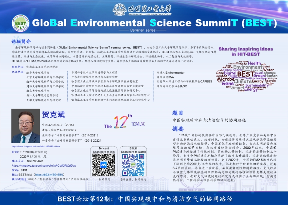 BEST的邀请,BEST第十二讲将由中国工程院院士贺克斌教授进行