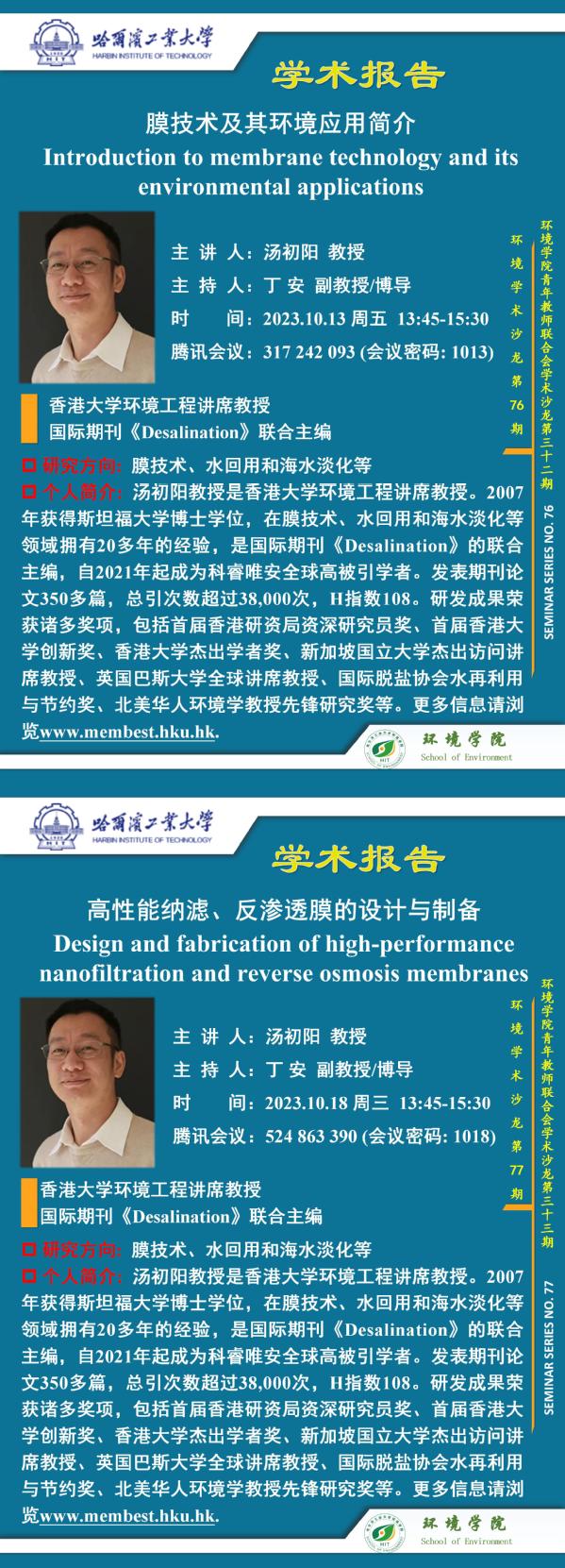 香港大学环境工程讲席教授汤初阳教授,将于2023年10月13日和10月18日与哈尔滨工业大学师生进行学术交流,欢迎感兴趣的师生参加线上学术报告会。