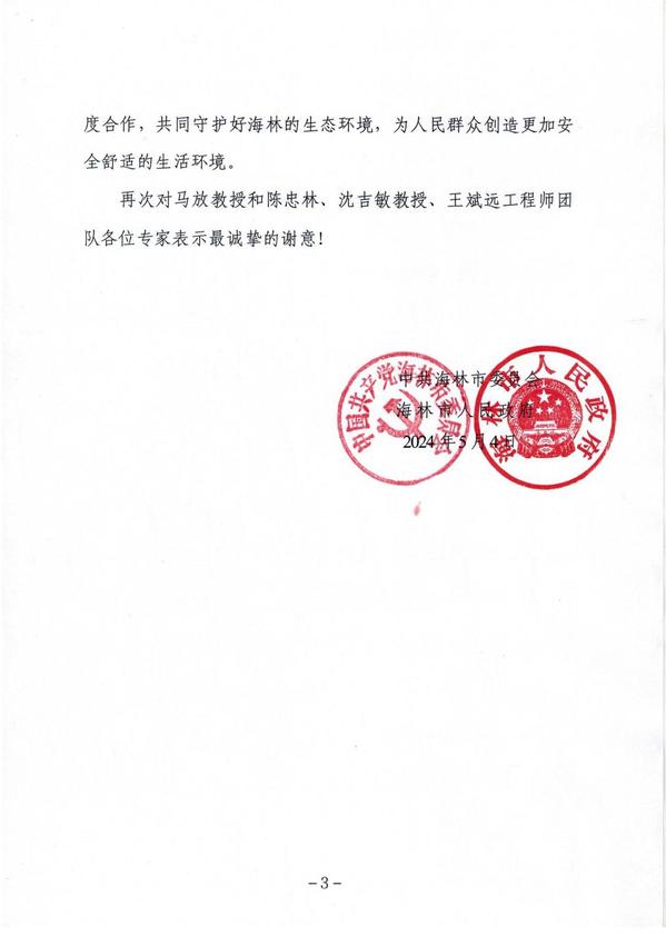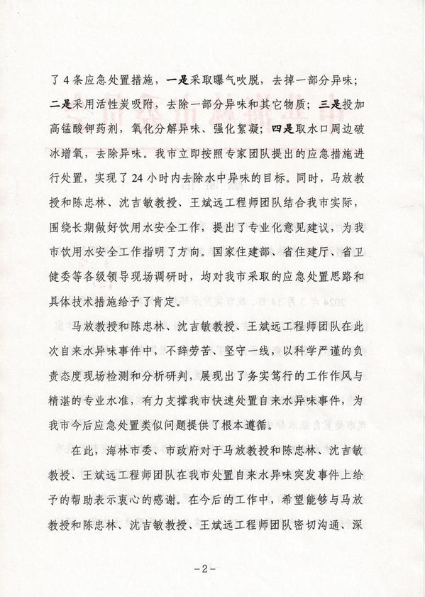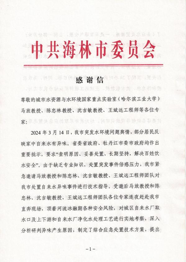 近日,彩客网 教师收到了一封来自海林市委、市政府的感谢信,信中表达了对城市水资源与水环境国家重点实验室马放教授、陈忠林教授、沈吉敏教授、王斌远工程师等各位专家的诚挚感谢。