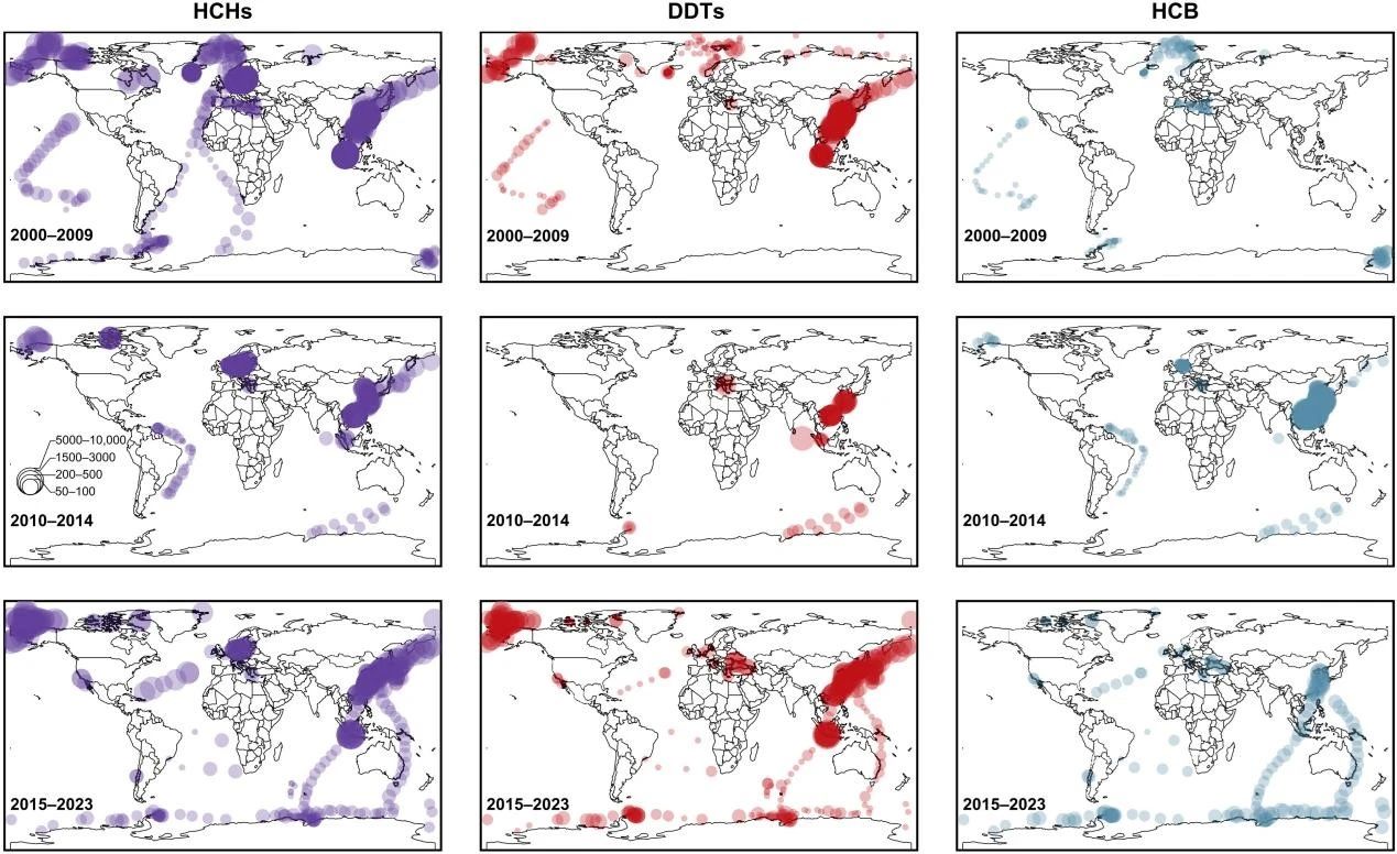 2000年至2023年全球海洋中HCHs、DDTs和HCB的时空分布。