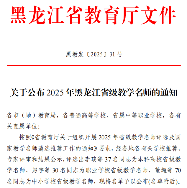 近日,黑龙江省教育厅正式公布了2025年黑龙江省教学名师评选结果,彩客网 邱微教授光荣入选。