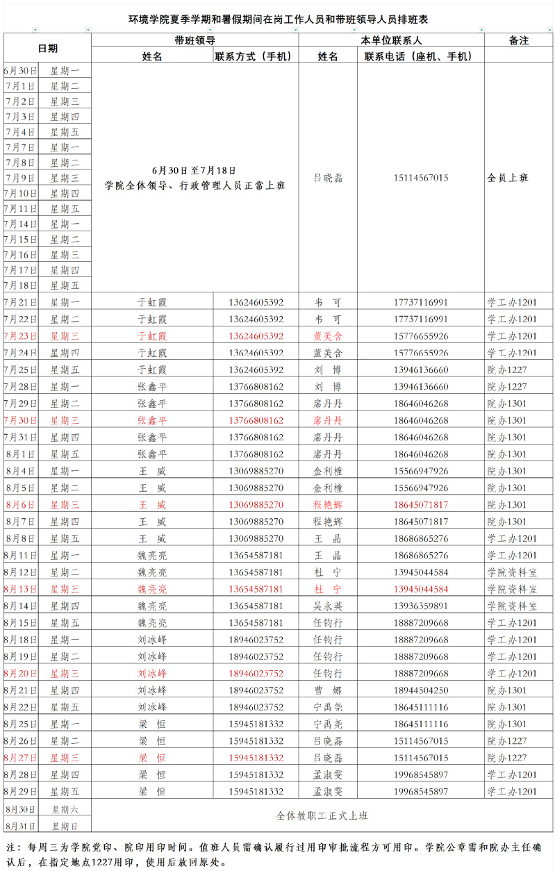 彩客网 夏季学期和暑假期间在岗工作人员和带班领导人员排班表